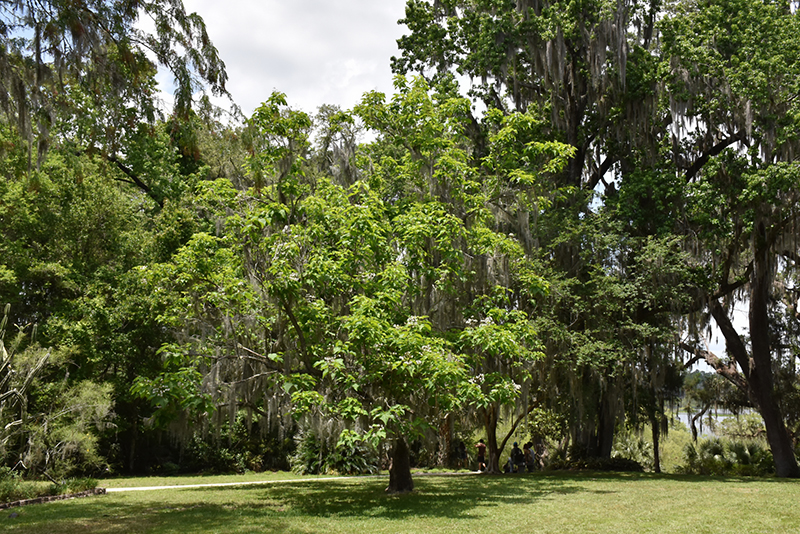 A medium sized shade tree with enormous leaves resulting in a very coarse texture, use where this is required; very showy white and purple flowers in early summer, long narrow fruits in fall, extremely adaptable