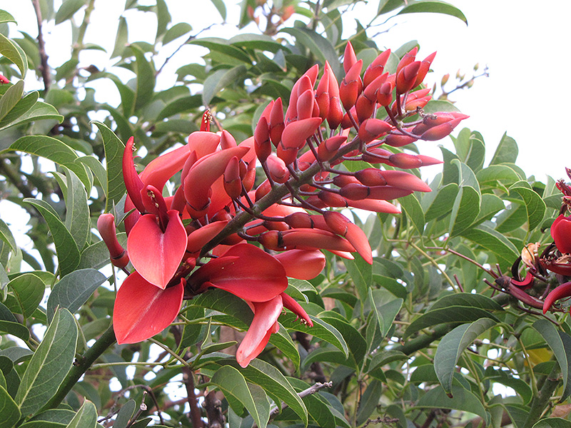 A deciduous tree with an upright, spreading habit on a rough, furrowed trunk; dazzling orange-red flower clusters, blooming year round; foliage is smaller than the species and pointed; attracts hummingbirds