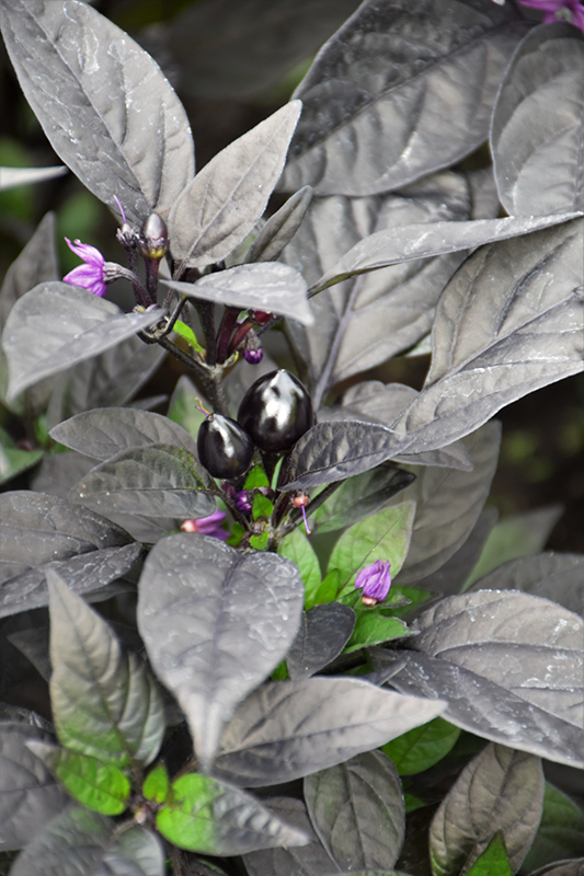 A beautiful ornamental pepper grown for its stunning black foliage and fruits; foliage emerges green and turns black in full sun; fruits are rounded peppers that are glossy black and very showy; a wonderful indoor container accent plant