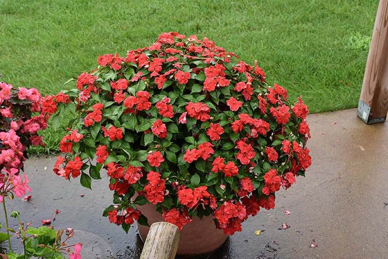 Beacon® Bright Red Impatiens is a fine choice for the garden, but it is also a good selection for planting in outdoor containers and hanging baskets. It is often used as a 'filler' in the 'spiller-thriller-filler' container combination, providing a mass of flowers against which the thriller plants stand out. Note that when growing plants in outdoor containers and baskets, they may require more frequent waterings than they would in the yard or garden.